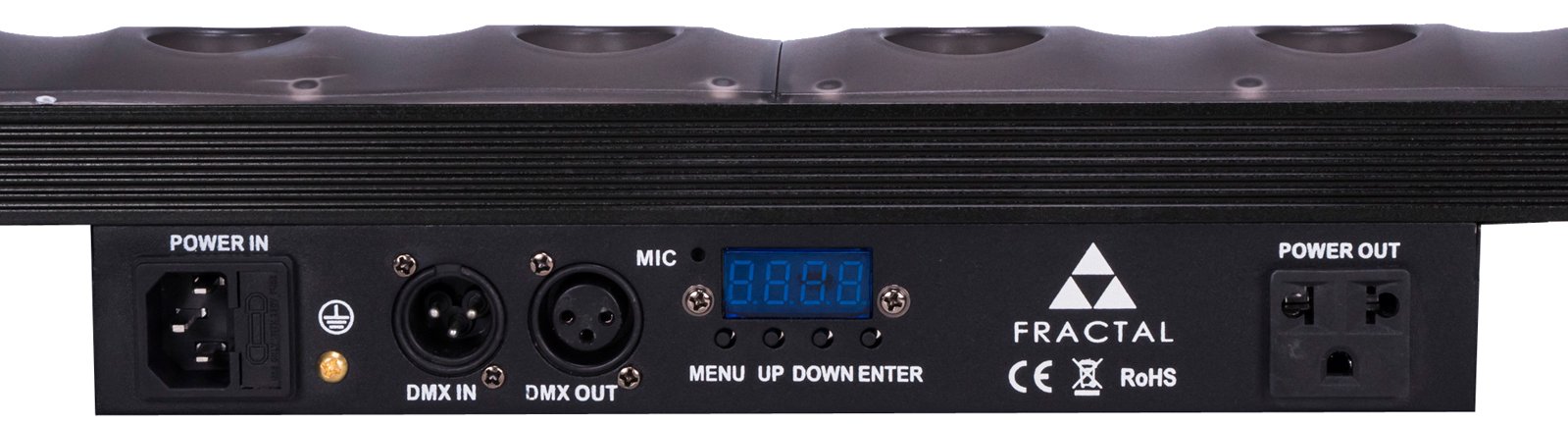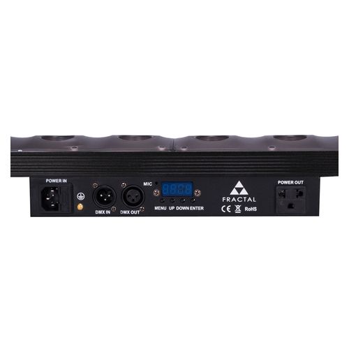 New in our range, a versatile effect, combining warm white beam, sunstrip-like effect with 24 zones of aura RGB background backlight. DMX controlable, includes automatic and sound programs.