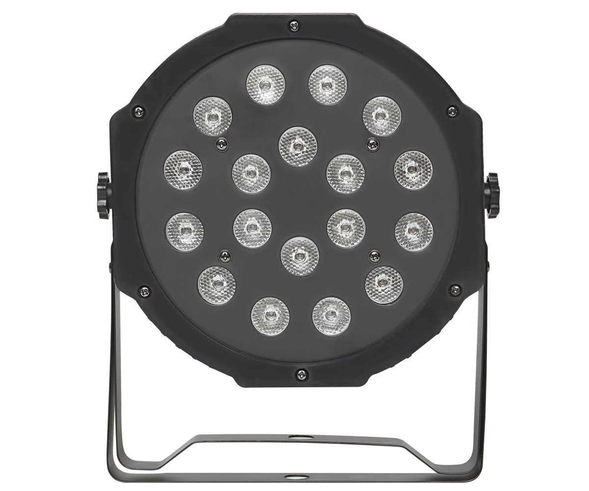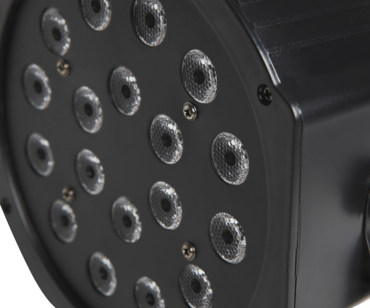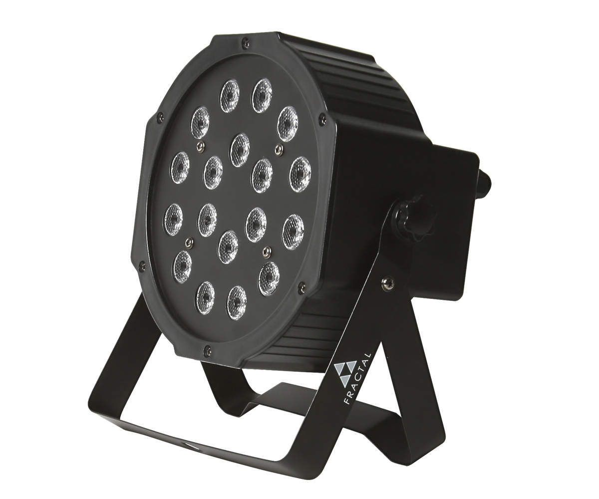 Fractal LED PAR 18 x 1W is a lightweight and efficient spotlight with standard LEDs. With included presets, you can control each colour separately. Easy operation. Includes a mounting, which can be used as a stand.