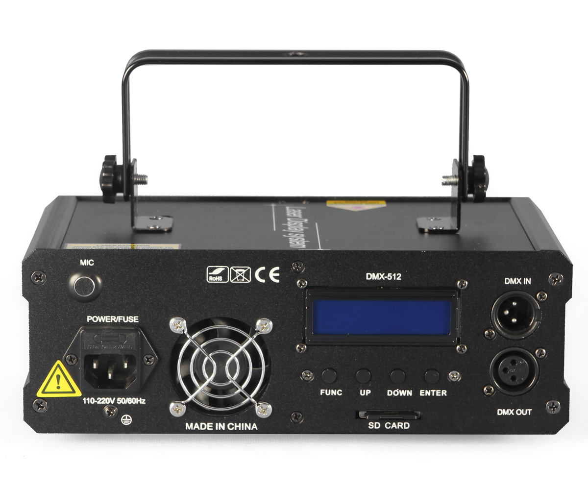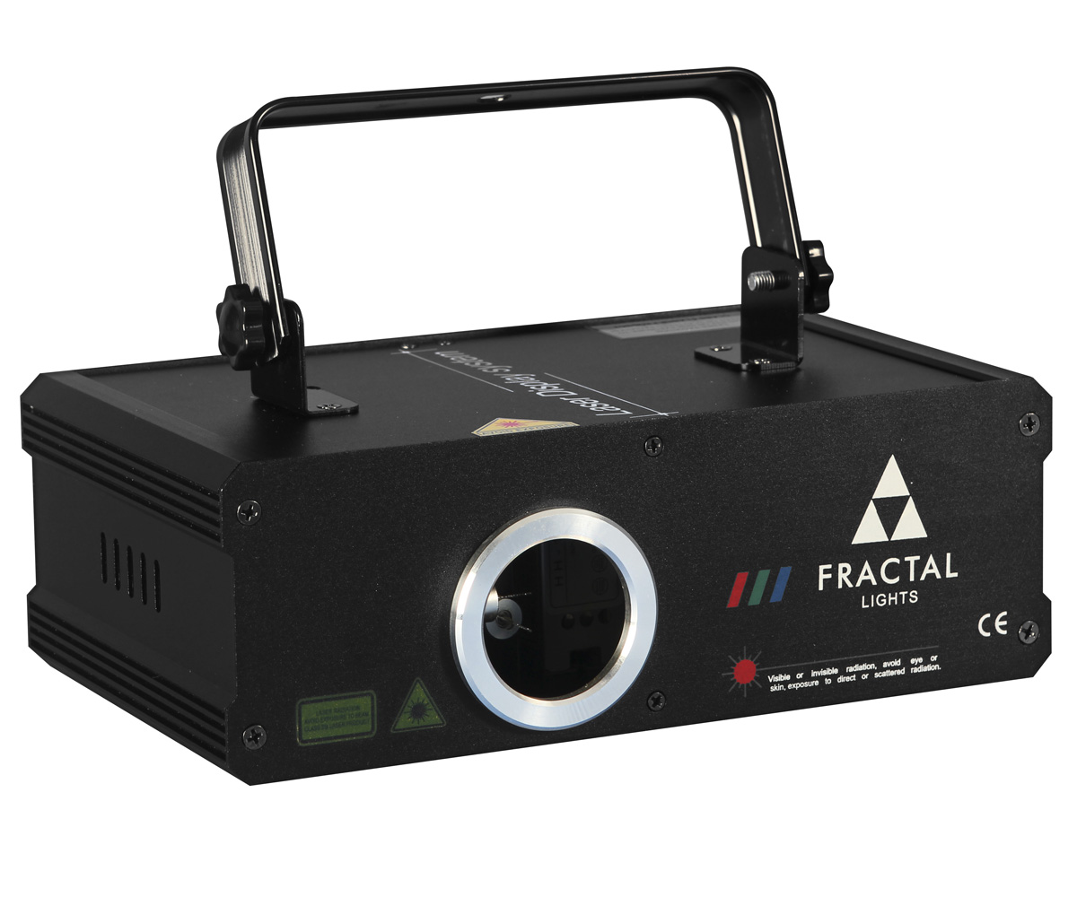Fractal Lights professional laser with high power emitters (600mW combined). Compact black metal enclosure. Can be controlled in DMX mode (13 channels) and work in automatic or sound mode thanks to built-in microphone with sensitivity adjustment. Perfect for each club, party, or disco. There is SD card slot available, to load user defined patterns.